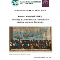 - Lunedì 24 novembre Federica Morelli terrà una lezione all'Università dell'Insubria per illustrare il progetto BlackItaly agli studenti e le studentesse dei corsi triennali di Storia Globale in età moderna e di Storia Contemporanea.
