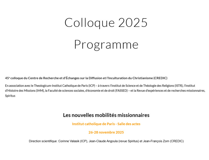 Giovedì 27 novembre 2025, in occasione del 45e colloque du Centre de Recherche et d’Échanges sur la Diffusion et l’Inculturation du Christianisme (CREDIC), en association avec le Theologicum-Institut Catholique de Paris (ICP), Giacomo Ghedini proporrà un intervento dal titolo: "Présences religieuses africaines en Europe avant la seconde moitié du XXe siècle : histoires oubliées et héritages contemporains". ,