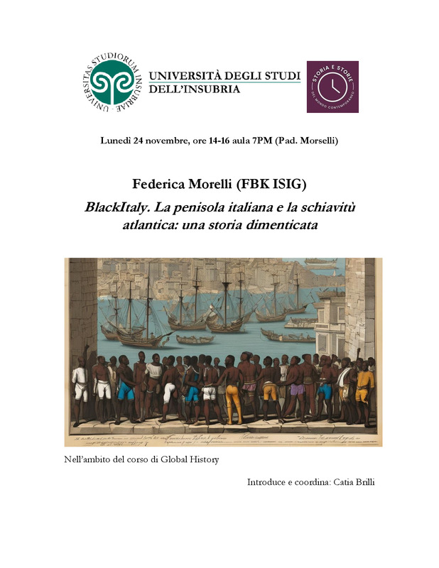 Lunedì 24 novembre Federica Morelli terrà una lezione all'Università dell'Insubria per illustrare il progetto BlackItaly agli studenti e le studentesse dei corsi triennali di Storia Globale in età moderna e di Storia Contemporanea. ,